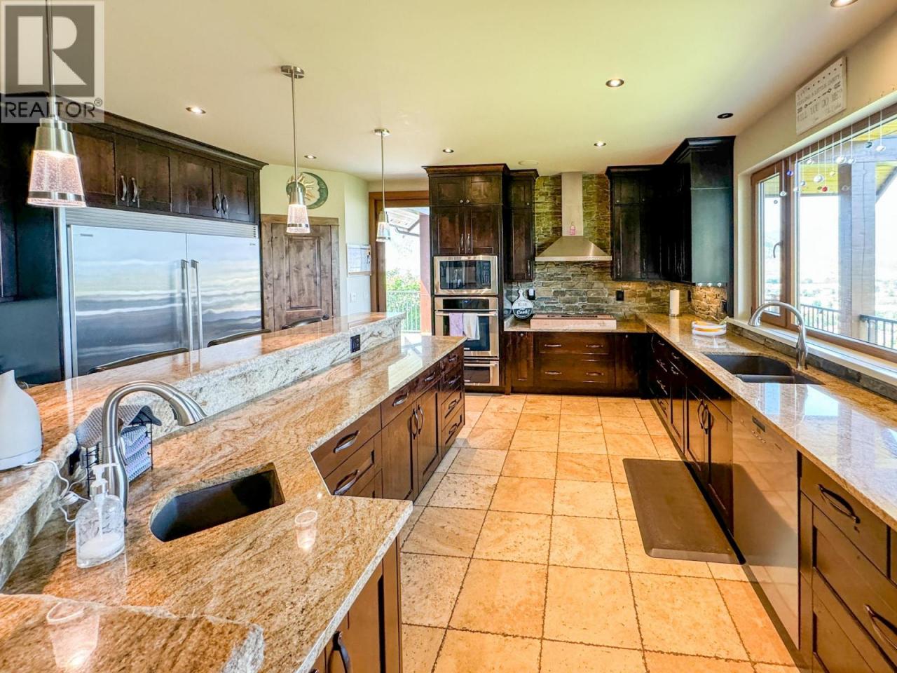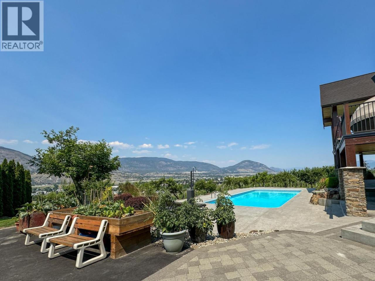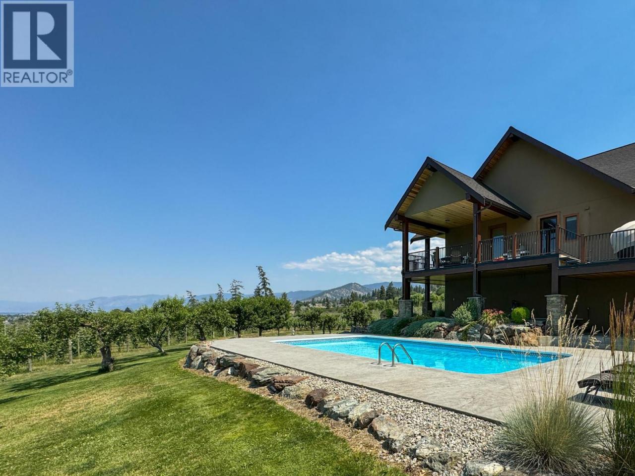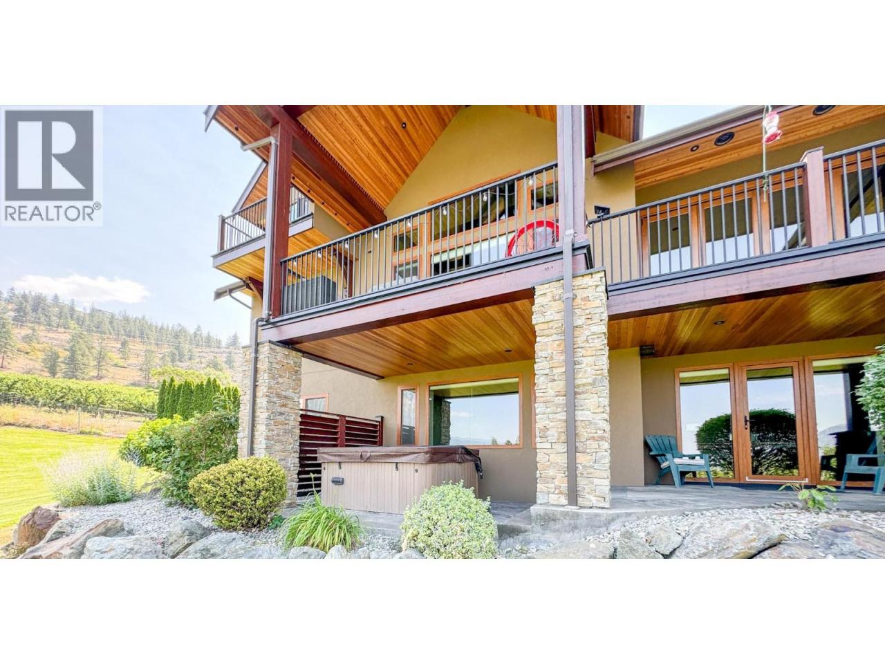 Stunning custom-built 5 bedroom, 5 bathroom executive home with vineyard on 17 acres in the heart of the South Okanagan Wine Country. Enjoy panoramic views of lush vineyards and majestic mountains, blending natural beauty with refined living. This modern rustic residence offers nearly 10,000 sq ft of meticulously designed living space with stone and wood exteriors that blend seamlessly into the landscape. A grand driveway leads to a multi-car garage. Inside, the open-concept living area features high ceilings, expansive windows, and a striking stone fireplace. The gourmet kitchen boasts custom cabinetry, live-edge granite counters, and premium appliances—perfect for entertaining. The primary suite occupies its own floor with a spa-inspired ensuite and breathtaking views. Additional highlights include a home bar, spacious laundry with outdoor access, and flexible garage space. The lower level offers a large recreation room ideal for a theater or games room, exercise area, wine cellar, and workshop with garage access. Outdoor living impresses with landscaped gardens, saltwater pool, and hot tub. Vineyard plantings include approx. 1.4 acres each of Gamay Noir and Pinot Gris, plus 5 acres of Gewürztraminer—ideal for those seeking the South Okanagan vineyard lifestyle. A rare opportunity to own a private estate offering luxury, serenity and world-class wine country living. Measurements approximate; buyer to verify. (id:6769)Construction Info