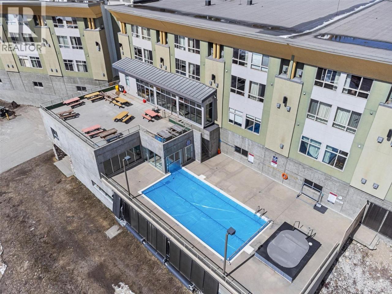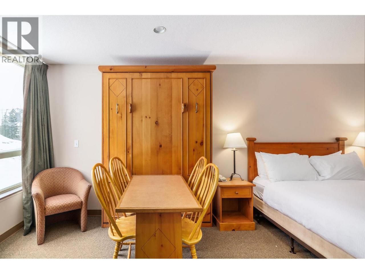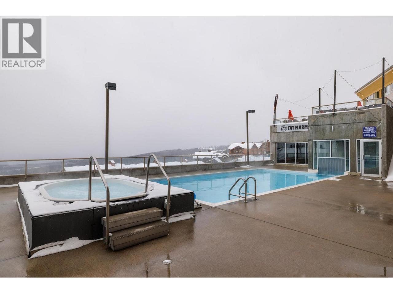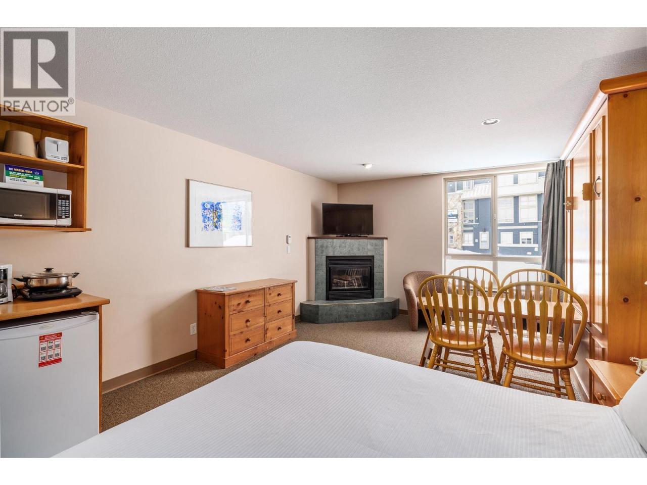 Ski-in/ski-out living in the heart of Big White. This deluxe studio suite offers a comfortable mountain retreat with direct access to the slopes and resort amenities. Designed for efficient living, the open-concept layout features a built-in Murphy bed and thoughtful furnishings that allow the space to comfortably sleep four. The kitchenette is equipped with upper and lower cabinetry, tile flooring, an RCA microwave and Danby mini fridge—perfect for preparing quick meals between ski runs. The living area is warm and inviting with carpet flooring, a cozy gas fireplace with tile surround, and a large window framing views of the pool, hot tub and surrounding mountains. The 4-piece bath features tile flooring, a single vanity with integrated lighting and a tub/shower combination. Owners and guests enjoy access to exceptional building amenities including an outdoor pool, hot tub, fitness room and games room, along with restaurants and bars just steps away. Additional features include secure parking, ski storage within the building, shared guest laundry on P2 and pet-friendly policies with restrictions. Whether used as a personal getaway or rental property, this well-positioned suite offers effortless access to everything Big White Resort has to offer. (id:6769)Construction Info